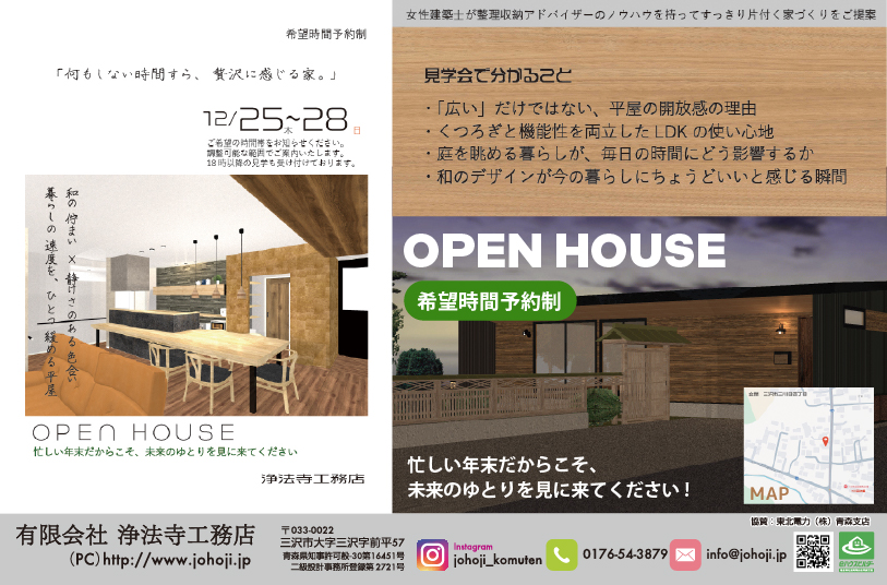 2025年12月25日(木)~28日(日)※希望時間のご予約制ご希望の時間帯をお知らせください。(18時以降の見学も受け付けております)調整可能な範囲でご案内いたします。